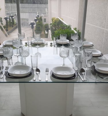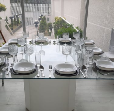 Mesas de 1.50 x 1.50 m con cristal templado de 10 mm, resistentes y sofisticadas.
